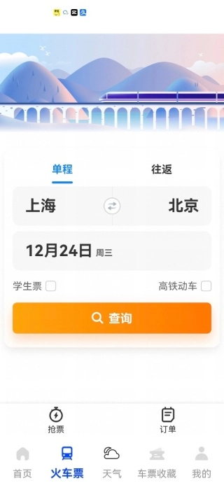 1、在首页填写出发城市、到达城市与出发时间后,即可查询火车票,此外还提供快查助手和预约抢票功能;