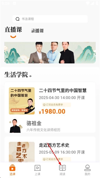 1、在选课页面点击底部阅读选项,进入阅读页面。