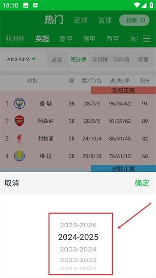 3、打开赛季选择弹窗,选择目标赛季,可切换赛事数据的统计赛季。