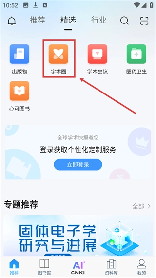 1、在界面顶部找到【学术圈】选项并点击,即可进入对应的板块。