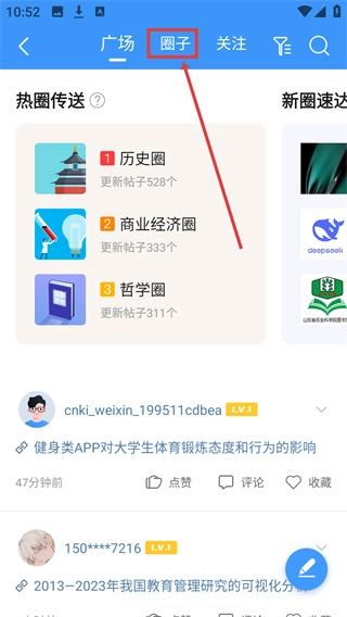 2、进入【学术圈】页面后,点击顶部的【圈子】标签,就能切换至圈子列表页面,查看热圈传送等相关内容。
