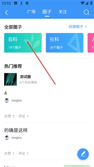3、进入【圈子】页面后,点击【自科】分类按钮,该分类下有19个圈子,可查看各圈子的内容。