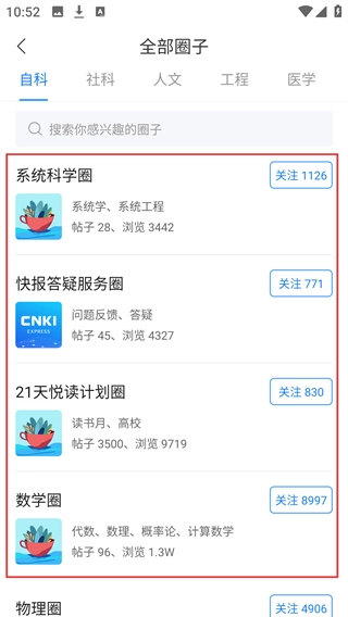 4、进入【全部圈子-自科】页面后,能看到【系统科学圈】等各类圈子,页面上会展示每个圈子的帖子数量、浏览量以及对应的关注按钮。