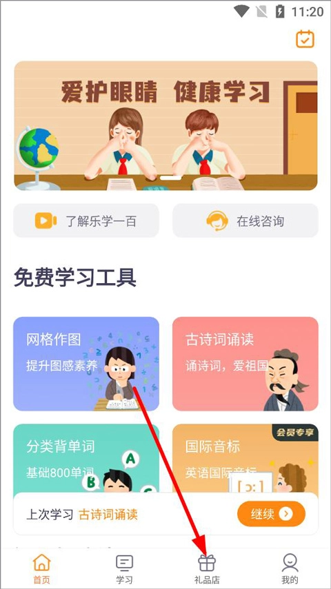 1、登录乐学100 ,进入首页点击礼品店;