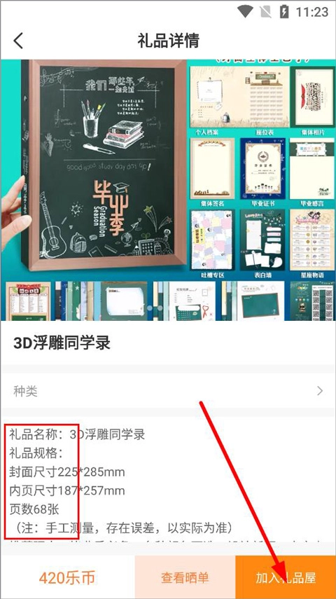 3、找到想要购买的礼品后,点击进入该礼品的详情页面,即可查看其种类、名称、规格、价格等基本信息,随后点击“加入礼品屋”按钮即可。