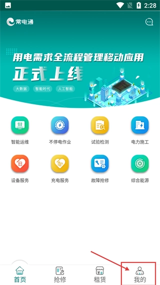 在【常电通】首页,点击底部的【我的】选项就能进入个人中心,首页设有智能运维等功能入口。