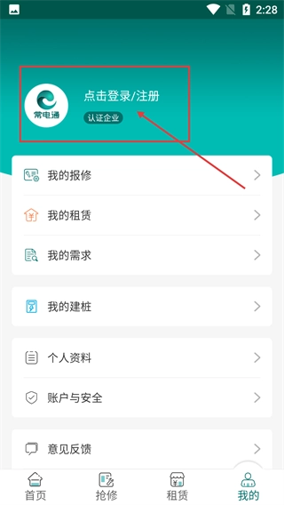 进入个人中心后,点击顶部的【点击登录/注册】区域,就能进入登录页面,这个页面里还设有我的报修、我的租赁等功能的入口。