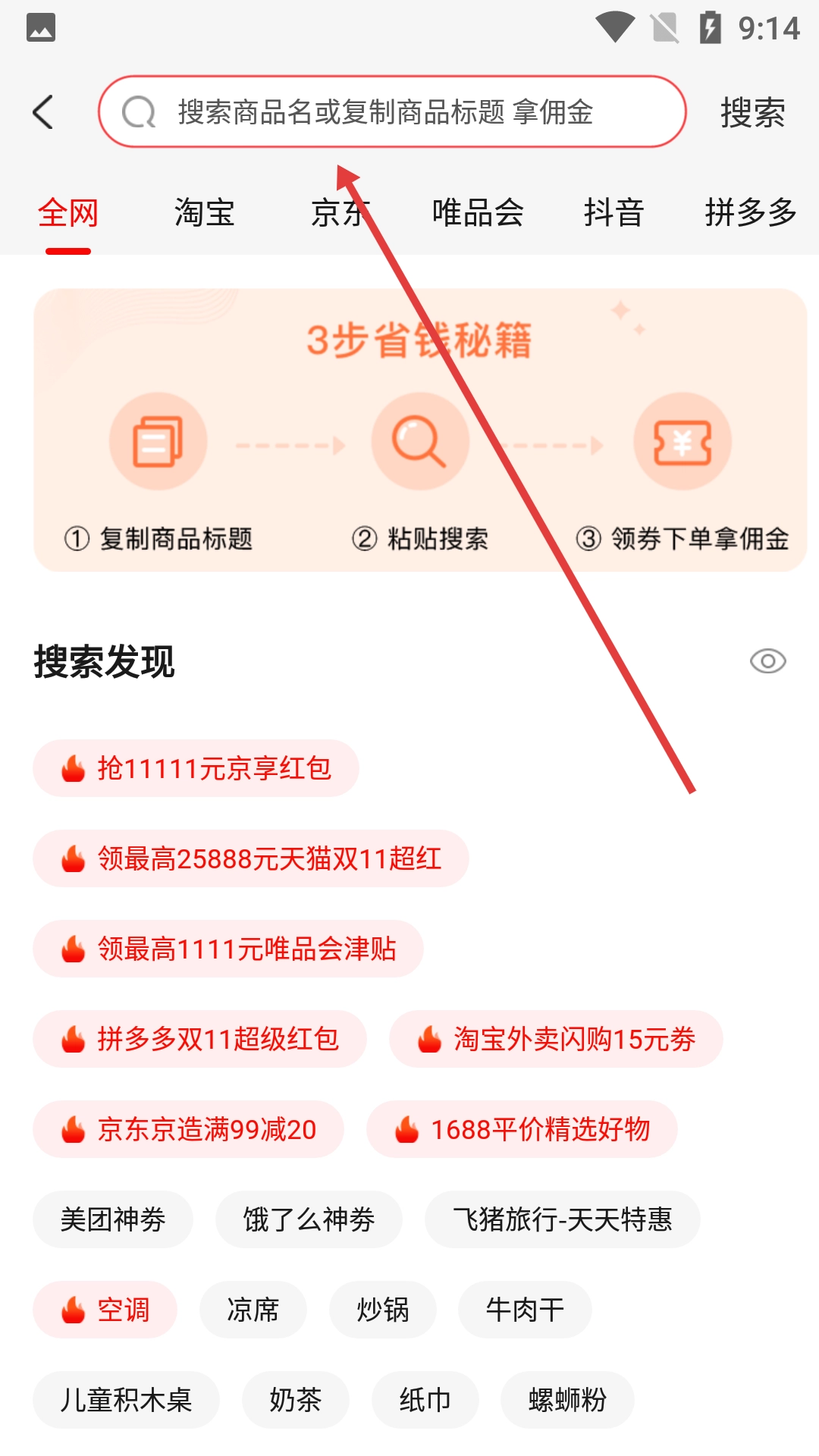 回到全网搜索界面,在搜索框中输入商品名称或者粘贴商品标题,然后点击【搜索】按钮。