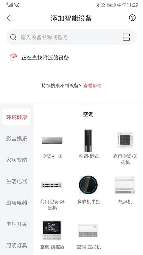 在设备界面中,我们能够对设备进行管理,还可以通过输入设备名称、型号或者扫码的方式添加智能设备。