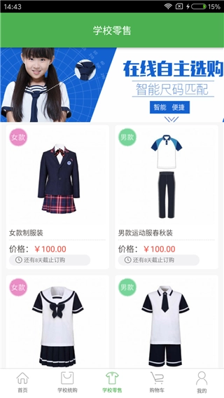 进入首页后,点击“多彩校服”选项,就能浏览所有款式的学生校服。