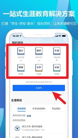 在“去选科”页面里,用户能够依据自身高一到高三阶段各科的成绩开展选科模拟匹配,以此辅助进行科学选科。