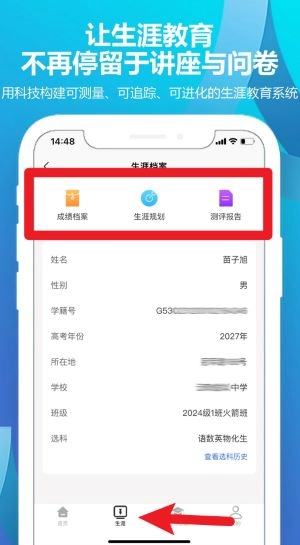 点击“生涯”栏目进入生涯档案页面后,能够查看成绩档案、生涯规划以及测评报告,从而构建起完整的个人成长档案。