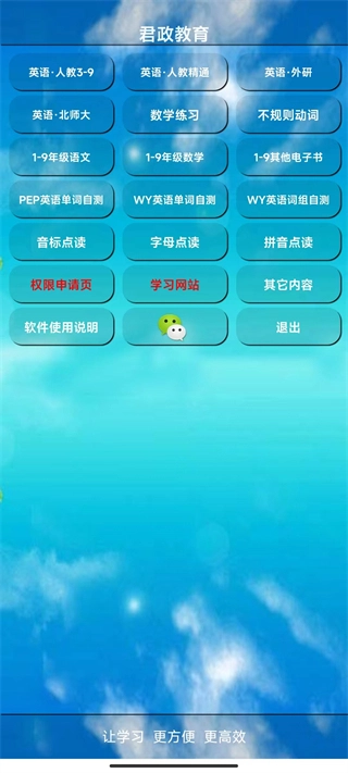 不管是哪方面的学习资料,在这里都能系统化学习,而且题库十分丰富,能帮助你在当前阶段进行相应训练!为满足用户的学习需求,君政教育还提供音标点读、字母点读、拼音点读以及wy英语词组自测等功能,学生可以在线点读英语课本上的单词、词汇和课文内容,这里还配备了教材课后习题功能,能有效帮助学生提升学习成绩。有需要的朋友快来体验吧!