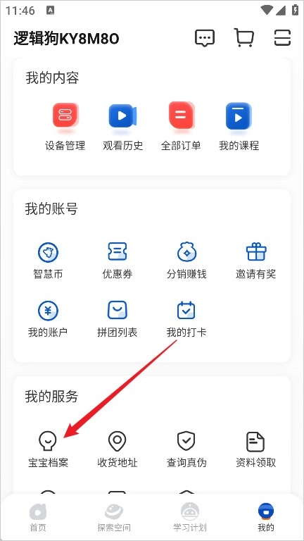 2、在个人主页往下滑找到宝宝档案点击进入。