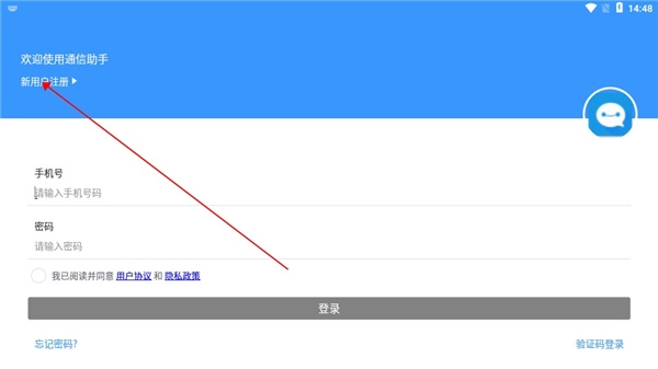 在本站安装并打开通信助手软件,进入后点击新用户注册选项,即可进入注册页面。