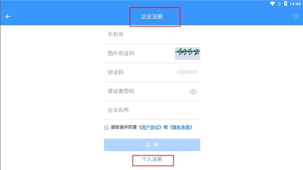 用户可选择企业注册或个人注册,填写电话号码并获取验证码后即可完成注册。