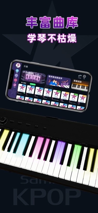 是提供丰富曲库的学琴,会根据当前应该弹奏的音符位置点亮相应的键位,引导用户正确地完成演奏。随着用户不断使用该应用进行练习,他们对五线谱的理解和识别速度都会得到显着提高。