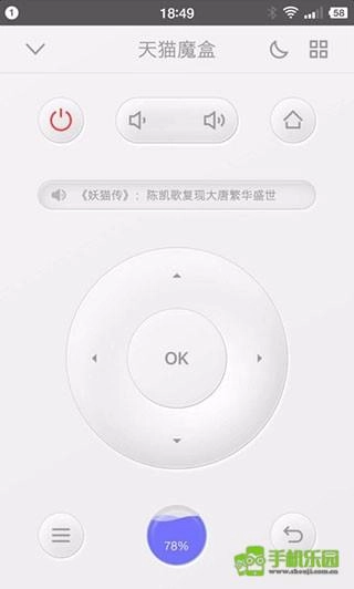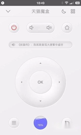 安装完毕之后,手机上重新连接阿里云盒子,这时候能够顺利连接了。打开界面后,有很多功能,如果需要使用遥控,点击底部中间的蓝色按钮,便进入到遥控器界面了。遥控器的使用