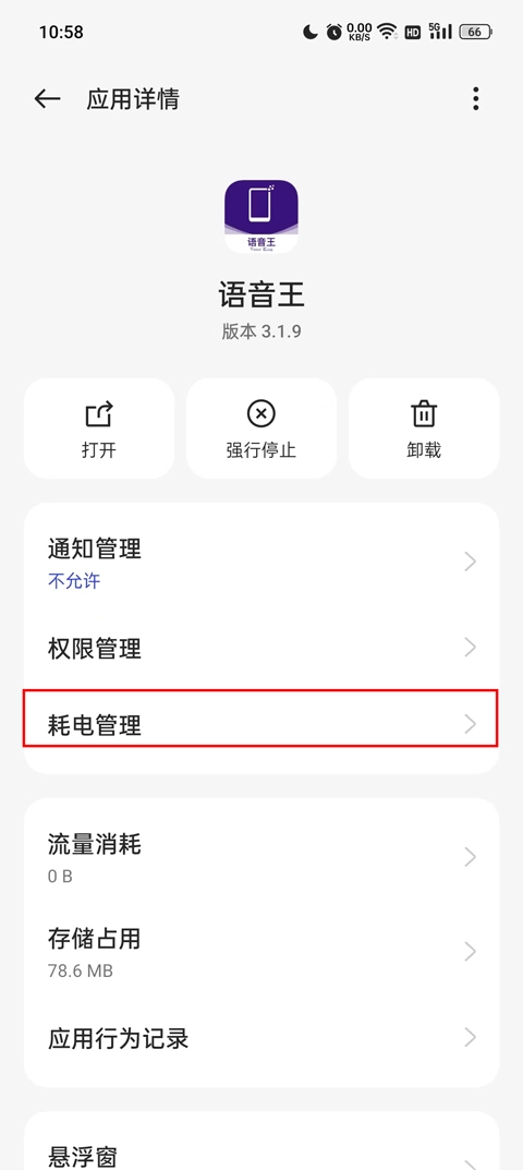 2、找到电池优化,会来到语音王应用详情页面,点击耗电管理进入;