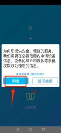 1、打开大白U帮应用,在权限申请页面点击同意按钮完成授权。