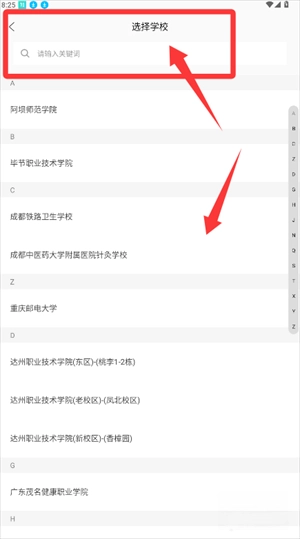 2、接下来,在“选择学校”页面,借助搜索功能或者浏览学校列表,找到并选定自己所在的学校。