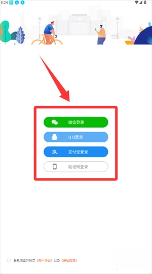 1、首先,可从微信、支付宝、验证码等方式中任选其一,完成账户登录操作。