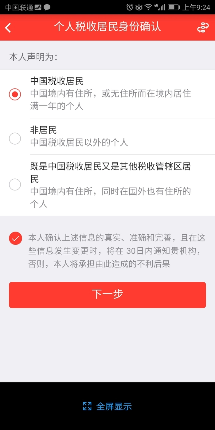 请依据实际情形进行选择,通常选择“中国税收居民”,确认无误后点击“下一步”按钮。