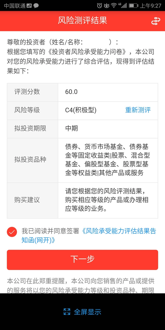 答题完成后查看风险测评结果,之后点击下一步