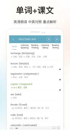 针对新课标高中英语新版教材,提供单词和课文的同步翻译服务,配备高清原声配音,支持跟读与点读功能。