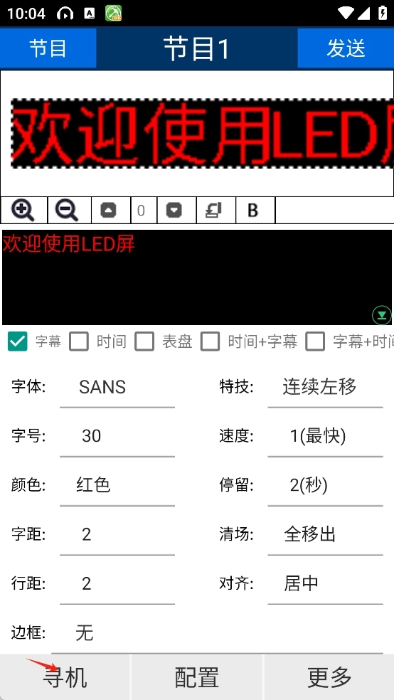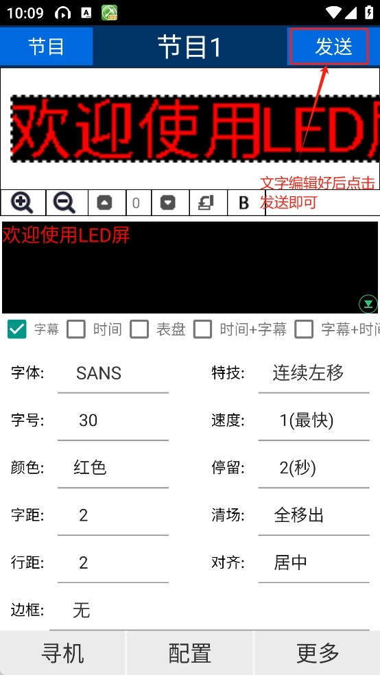 2、显示屏参数加载完成后,返回主界面进行文字编辑,设置文字大小、速度等选项,点击“发送”即可成功显示。