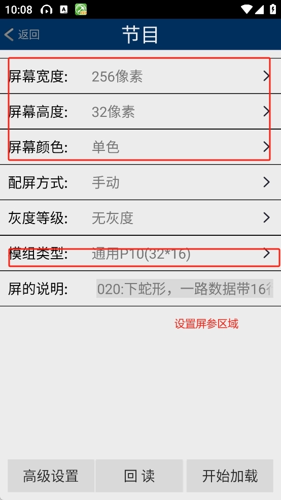 1、点击配置按钮进入配置界面,根据显示屏的实际参数完成各项设置,并选择对应的模组。设置完成后点击“开始加载”,加载成功后将进入显示屏主界面;若需调试数据极性、OE极性或扫描点频,可进入高级设置进行调整。后续使用时仅需通过“回读”功能即可,无需重复加载操作。