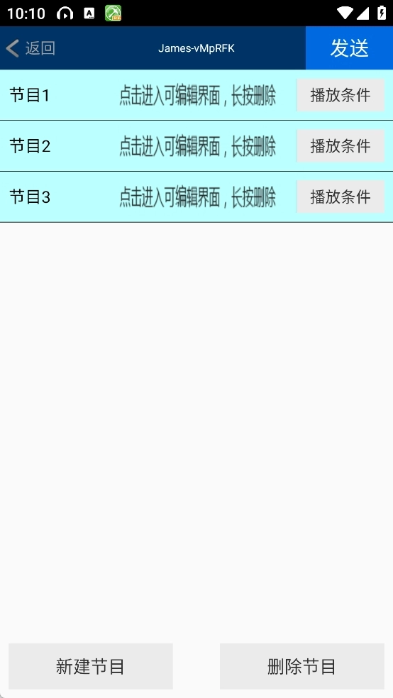 若需要添加多个节目,可点击左上角的“节目”选项进入节目界面。接着点击“新建节目”,之后选中你刚创建的节目条,进入主界面进行内容编辑,操作步骤与第三步相同。编辑完成后,直接点击发送按钮即可。