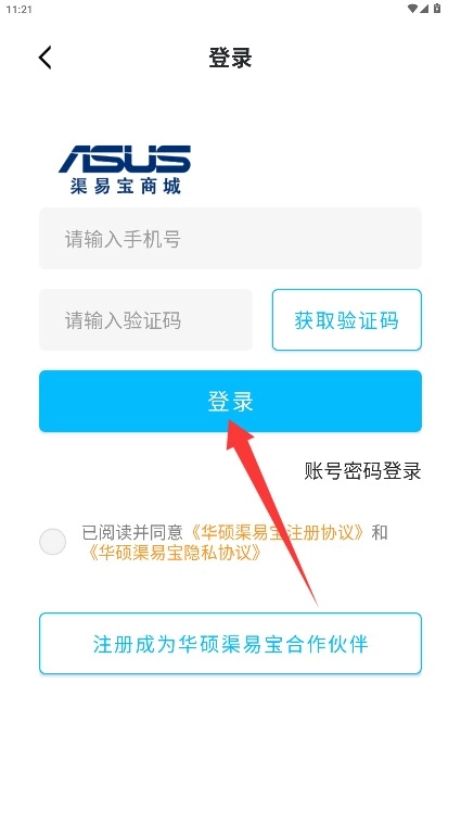在登录页面填写账号与登录密码,勾选同意相关条款后点击登录按钮,即可进入应用。