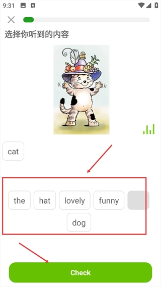 4、根据播放音频选择对应的词汇选项后,点击【Check】按钮提交本次练习的答案。
