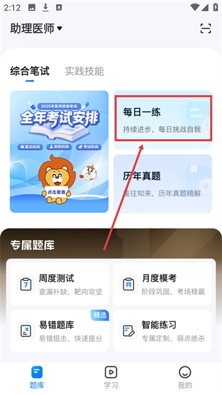 1、在【题库】页面找到【每日一练】板块,点击即可进入对应的练习入口。