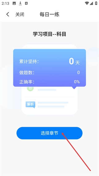 2、进入【每日一练】页面后,可查看累计坚持天数、做题数等数据,点击下方【选择章节】按钮,即可进入章节选择界面。