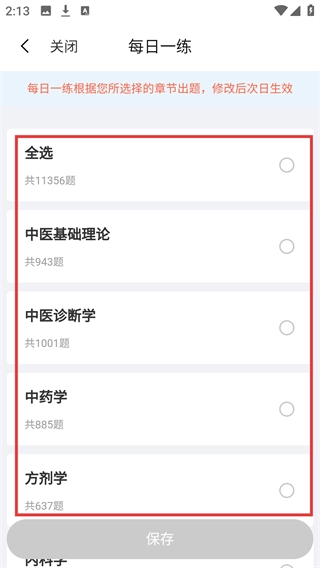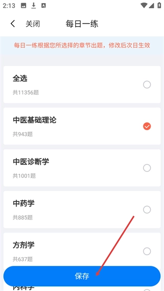 4、选定目标章节(如【中医基础理论】)后,点击底部【保存】按钮,即可完成每日一练的章节设置。