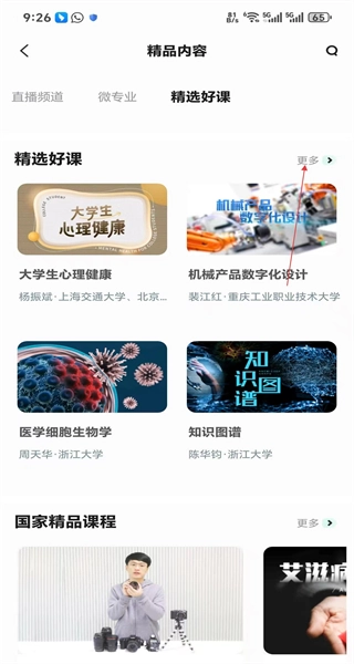 1、打开软件后,进入精选好课页面,看到大学生心理健康等课程卡片,找到精选好课的更多按钮准备查看全课。