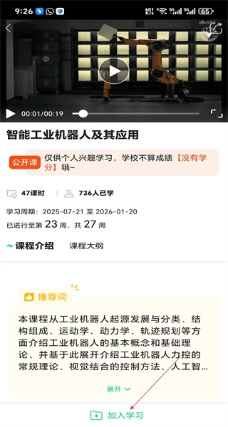 3、进入智能工业机器人及其应用课程详情页,查看课程时长学习周期等信息,找到加入学习按钮并点击完成课程加入。