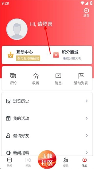 在新闻页面点击底部我的,进入个人中心页面。