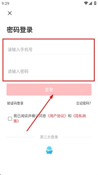 在密码登录界面输入手机号与密码,勾选相关协议后,点击【登录】按钮即可完成账号登录流程。