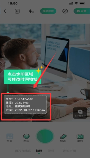1、拍摄基础操作:进入拍摄界面后,将镜头对准拍摄目标,轻触快门按钮就能完成拍摄,系统会自动为照片添加当前的水印。