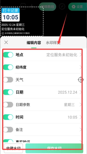 3、接着点击编辑内容,选择地点、时间和日期,之后再点击右下角的保存水印按钮。