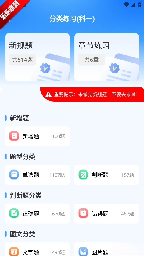 功能:依据知识点对题库进行分类(像交通标志、交规法规、安全文明驾驶等类别),能够满足用户开展针对性练习的需求。