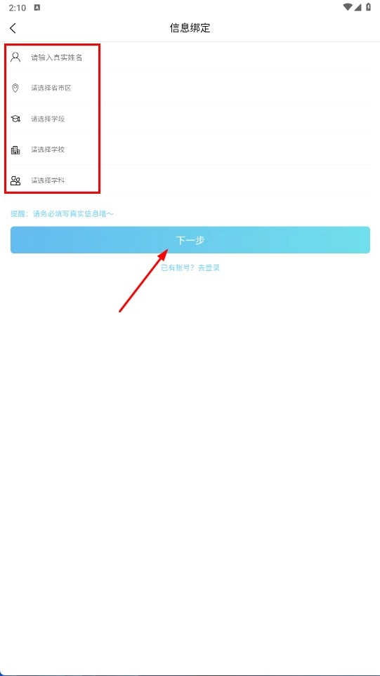 在信息绑定页面,填写真实姓名,依次选择所在省市、学段、学校和学科,之后点击【下一步】功能按钮。