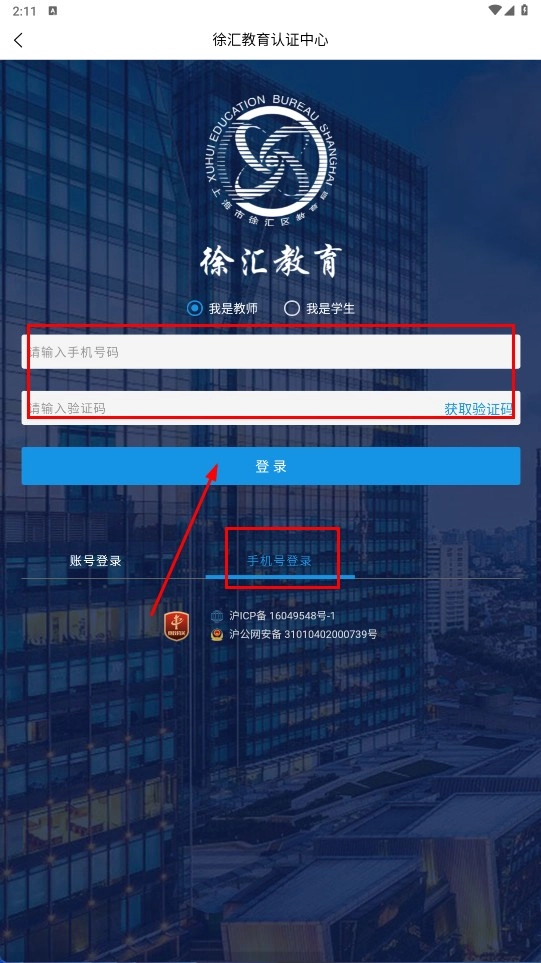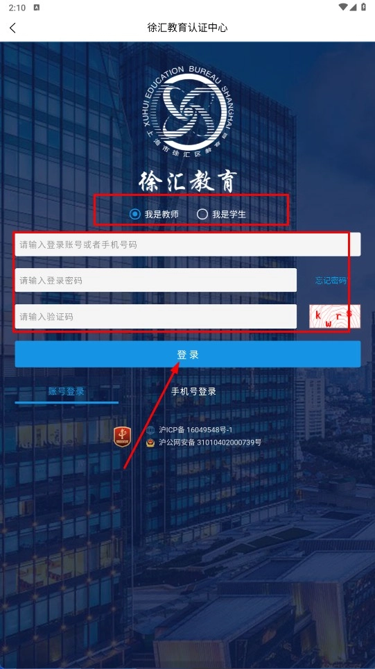在徐汇教育认证中心的账号登录页面,先选定对应的身份类型(可选择“我是教师”或“我是学生”),接着依次填写登录账号、密码,并准确输入验证码,完成这些操作后,点击界面上的【登录】功能按钮即可。