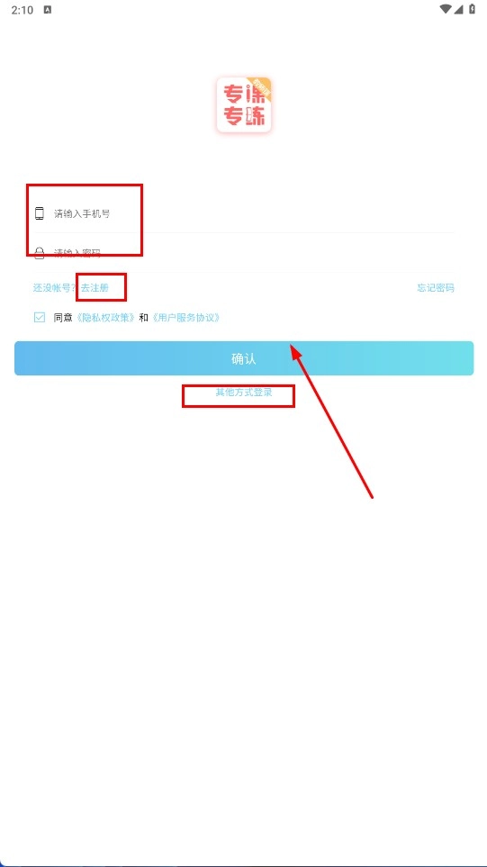 在登录注册页面,填写手机号与密码后,点击【确认】功能按钮即可登录;若需注册新账号,可点击【去注册】选项;此外,还能选择【其他方式登录】完成操作。