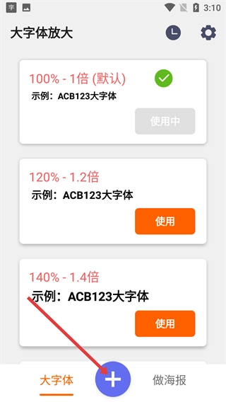 进入【大字体放大】界面后,既能够挑选预设的倍数,也可以点击底部的蓝色加号,从而进入【自定义字号】页面。