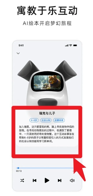 进入首页后,能借助AI绘本开展互动式故事播放,像“瑞克与儿子”这类内容兼具趣味性与教育意义,很适合6到8岁的儿童进行启蒙和成长。