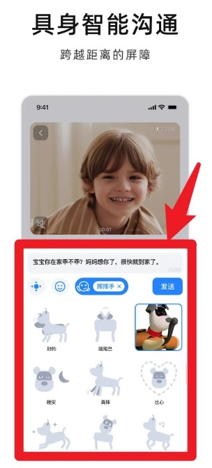 具身智能沟通功能支持远程选定动作和语音,借助拟人形象与孩子展开互动,从而达成跨地域的实时陪伴与安抚效果。